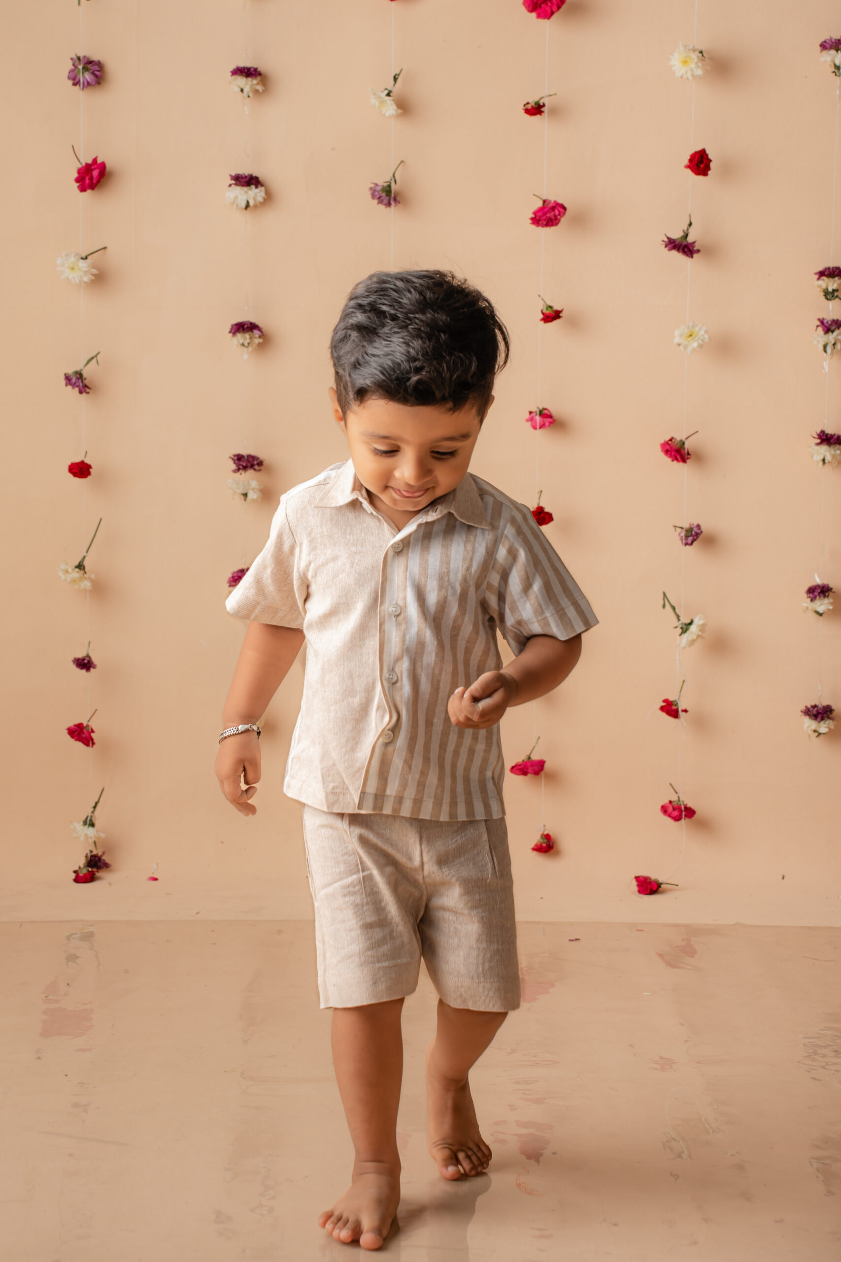 1 review for Beige Linen Bowler shirt shorts co-ord set for boys
